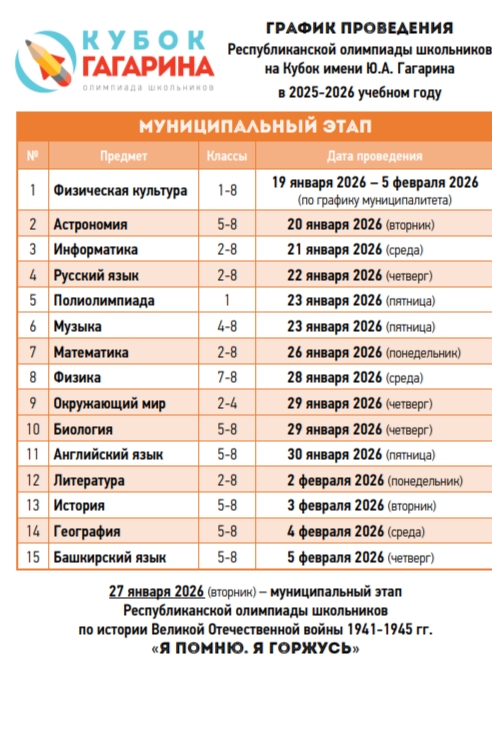 Муниципальный этап Олимпиады на Кубок им.Ю.А.Гагарина пройдет с 19 января по 5 февраля 2026 года.