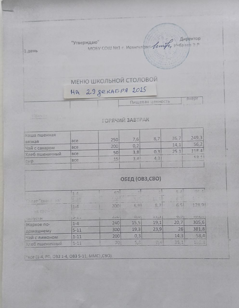 (меню на 29.12.2025)